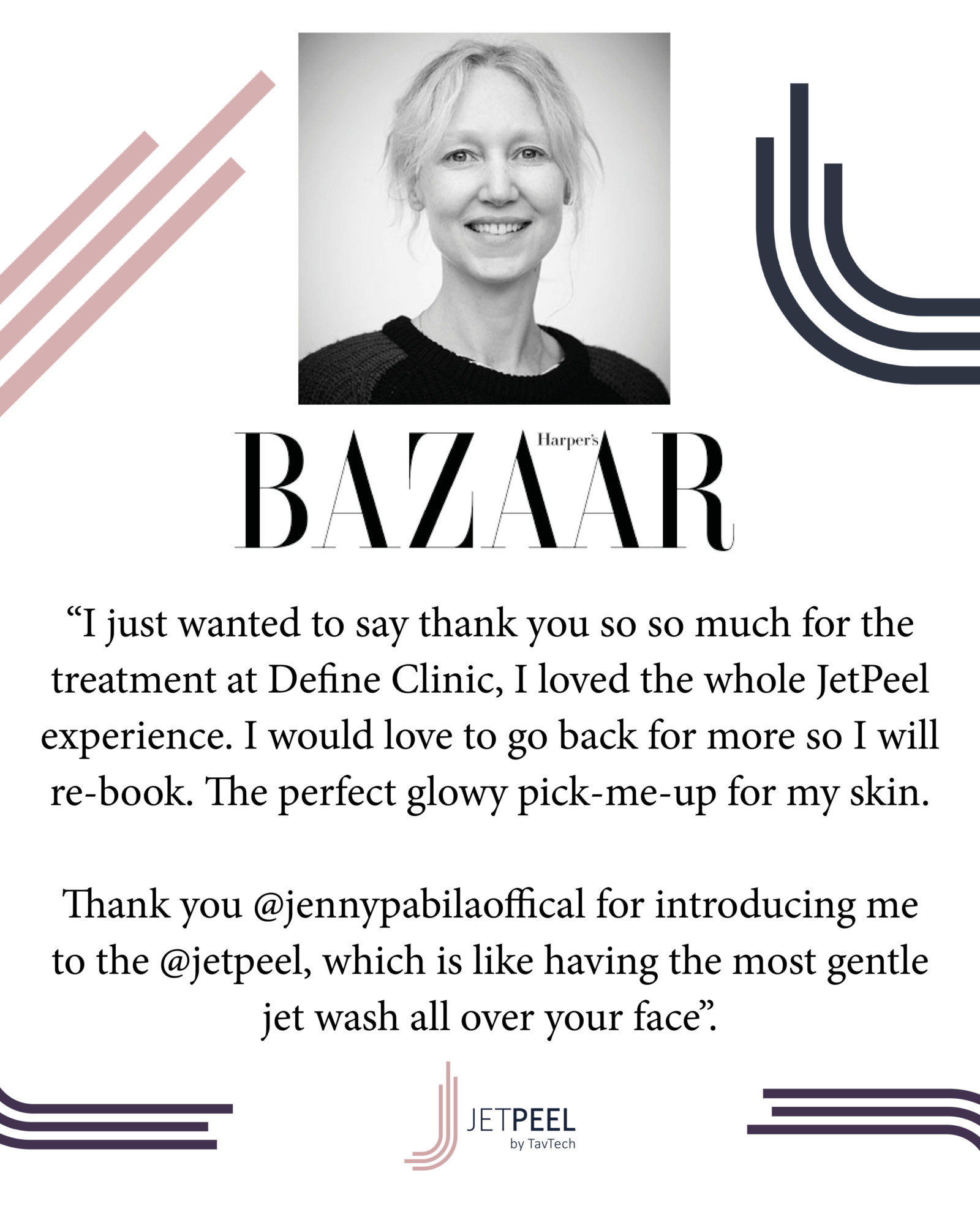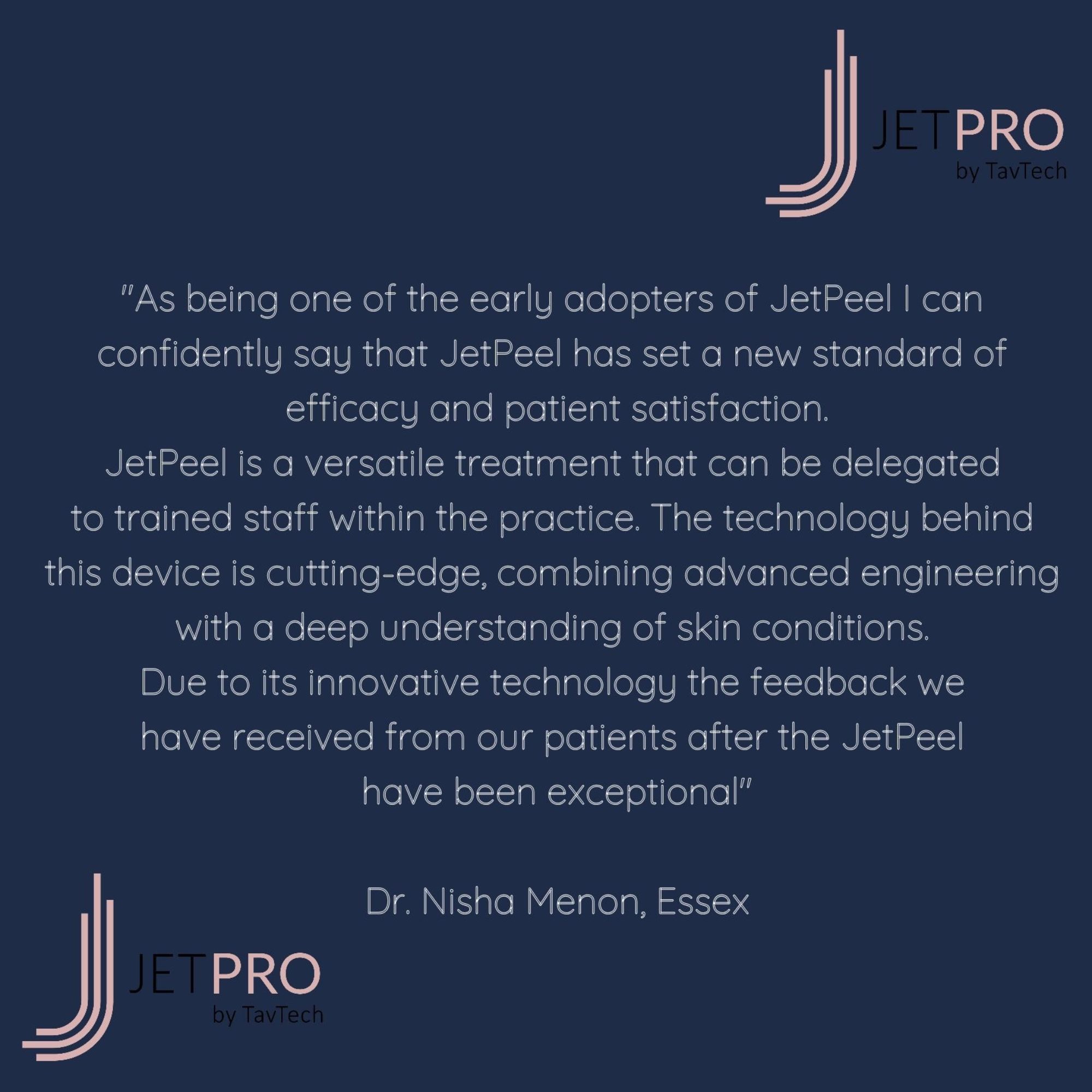 Based on aviation technology, adapted to the needs of modern skin care, JetPeel by TavTech utilises unique patented technology using jet pressure energy to generate fine, misty, high-velocity jet streams of liquid micro-droplets mixed with air pleasantly impacting the skin at sub-sonic speeds. This jet pressure energy enables aesthetic practitioners to perform rejuvenation treatments starting with a lymphatic massage to remove waste and toxins, followed by gentle exfoliation and effective infusion of skin renewal and anti-ageing solutions into the dermis. The treatment is pleasurable, non-invasive, safe, needle-free, pain-free and non-contact for cosmetic enhancement, with zero downtime and immediate results.