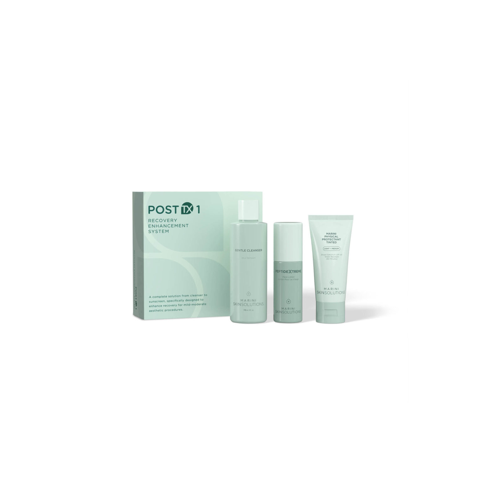 A 3-step post-procedure skincare system that cleanses, hydrates, and protects. Gentle Cleanser soothes sensitive skin, PeptideXtreme hydrates and reduces redness while diminishing fine lines, and Marini Physical Protectant SPF 45 shields against sun damage and photo-ageing with a universal tint.