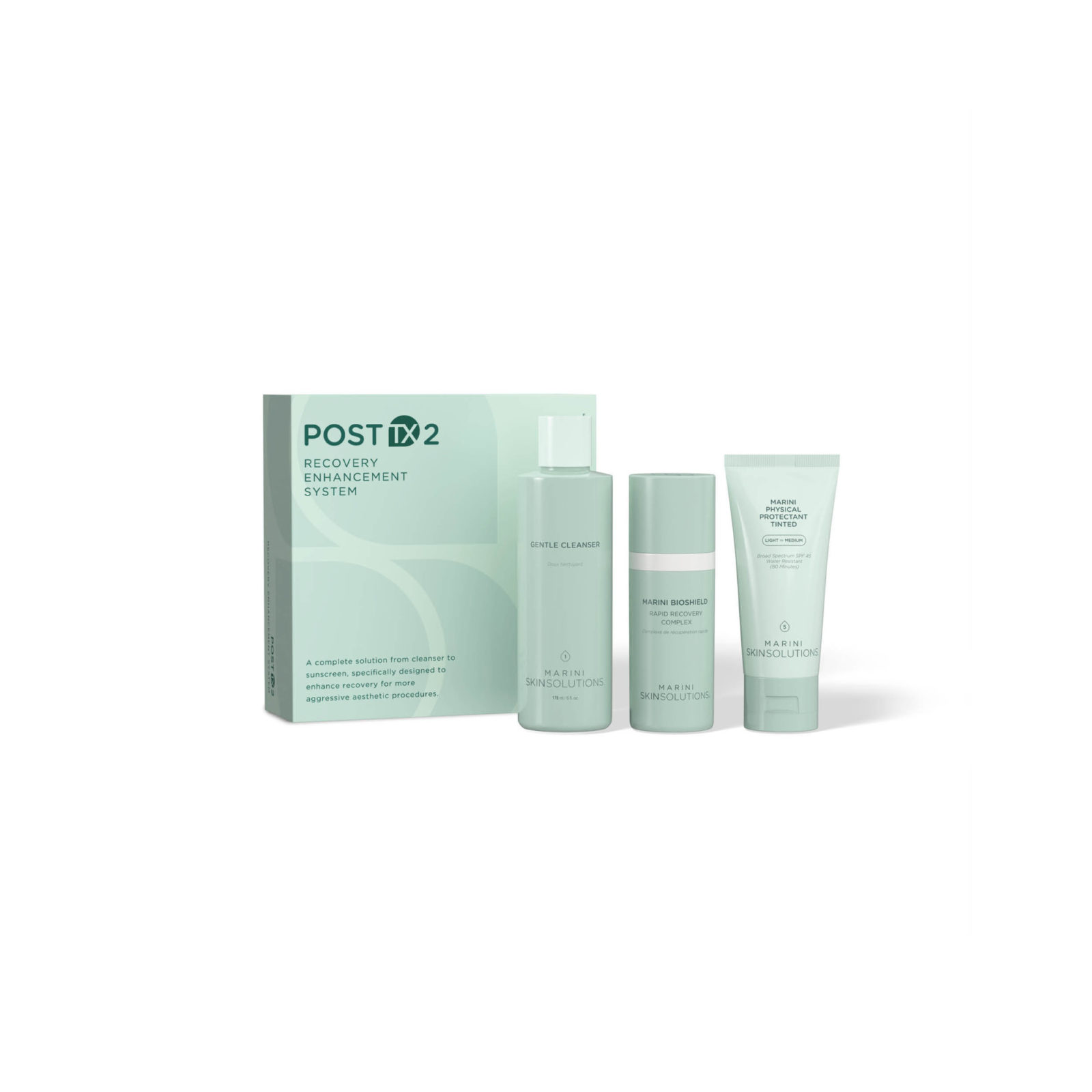 A 3-step post-procedure skincare system that cleanses, hydrates, and protects. Gentle Cleanser soothes sensitive skin. Bioshield protects compromised skin without the mess of petrolatum, while potent growth factors, peptides, hyaluronic acid, and CoEnzyme Q10 support healing, reduce redness and deeply hydrate for optimal recovery. Marini Physical Protectant SPF 45 shields against sun damage and photo-ageing with a universal tint.